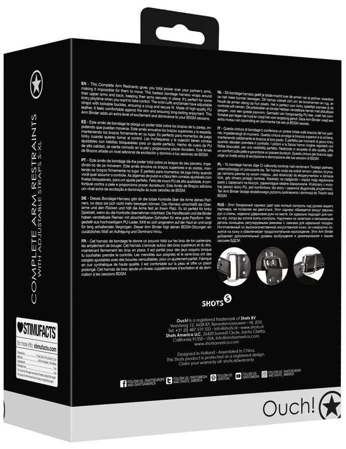 Ces attaches de restriction pour les bras sont idéales pour mettre les bras dans le dos et les bloquer.Avec des brassards ajustables du S au XL.Menotte centrale pour glisser les poignets. En simili (polyuréthane).