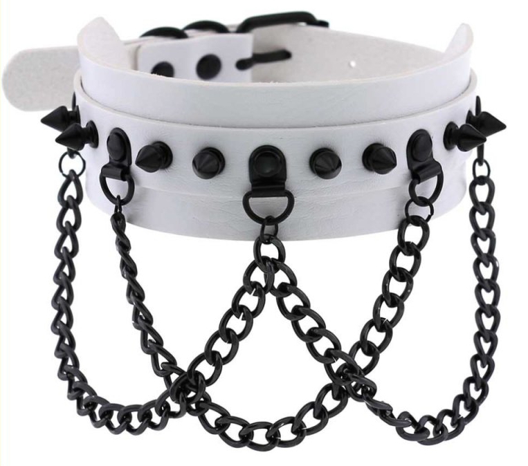 Ce collier Piky est réalisé avec de courtes pointes en métal qui apportent un style Dark.Il est blanc avec le contraste en noir.Il est complété par de fines chaînes en métal. La largeur du collier est de 4.5cm. Le tour de cou va de 31 à 41cm. Fabriqué en simili (polyuréthane)