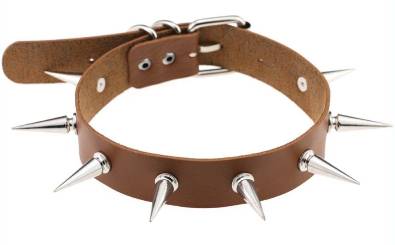 Cet accessoire est un collier marron avec des pointes en métal. Elles mesurent 3cm.Il donne un look plus Dark et SM pour les moments coquins. Avec une largeur de 2.5cm.Le tour de cou va de 32 à 40cm. En simili (polyuréthane)