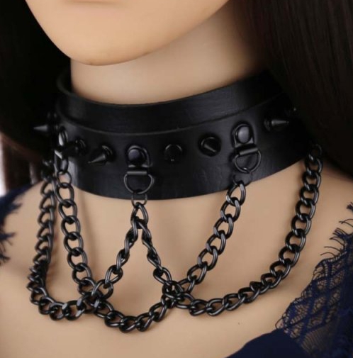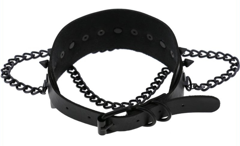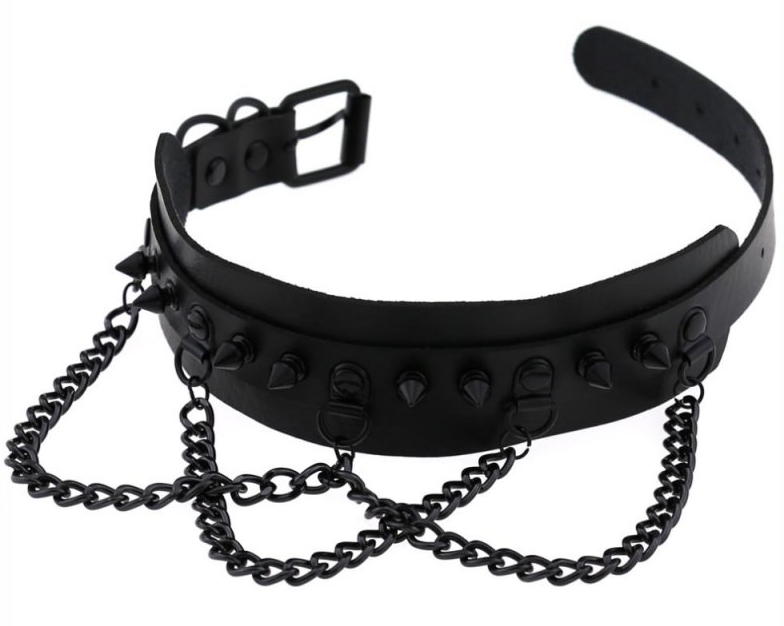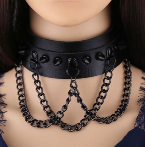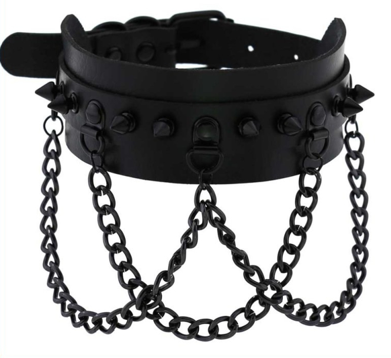 Ce collier à pointes Piky est ici dans sa version toute noire.La largeur du collier est de 4.5cm. Il comporte de courtes pointes et des chaînes en métal.Le tour de cou va de 31 à 41cm. Il est fabriqué en simili (polyuréthane)