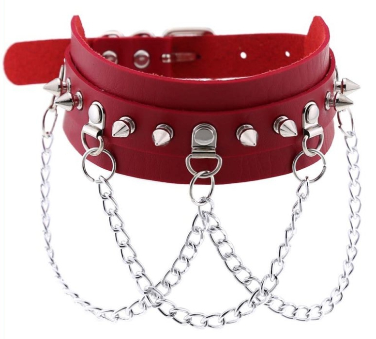 Ce collier à pointes rouge est réalisé avec des chaînes et des pointes en métal. Il donne un style élégant et sexy et renforce l’intensité dans les moments les plus coquins.La largeur du collier est de 4.5cm.Le tour de cou va de 31 à 41cm. En simili (polyuréthane)