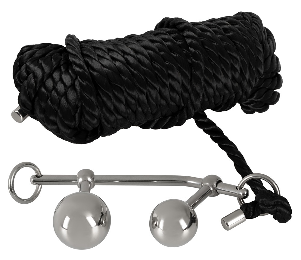 Cet accessoire est composé d’un double plug en forme de boule avec des diamètres de 3cm et 3.8cm. Il est en métal. La corde noire de 10m de longueur (en nylon) vient relier les deux éléments et permettre des jeux plus excitants. Poids de 149 grammes.
